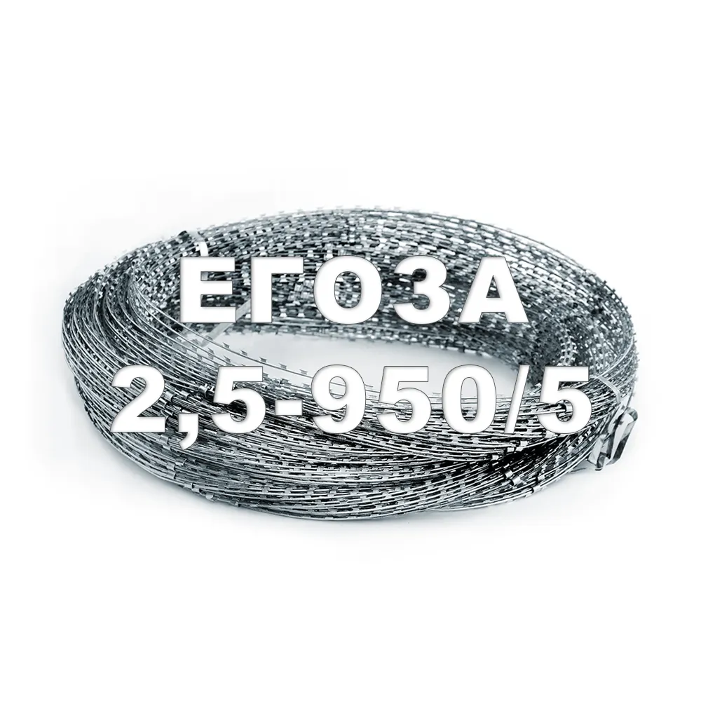 Заграждение из армированной колючей ленты спиральное ЗКАЛ-С «Егоза-2,5-950/5» предназначено для установки на заборы и другие строения. Заграждение имеет диаметр витка 950 мм с пятью монтажными скобами на виток спирали и изготовлено из армированной колючей ленты ЛКА «Егоза-2,5» с диаметром сердечника 2,5 мм и толщиной лезвий 0,5 мм. Заграждение изготовлено из высокоуглеродистой проволоки и рулонной стали, имеющих покрытие горячим цинкованием для защиты от коррозии.